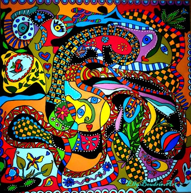 Het is een dans door het leven van verbinding en vrijheid. Schilderen is voor mij een vorm van expressie, meditatie, beweging en fantasie. Mijn werk laat zich niet in een hokje plaatsen , het is abstract, gebeurt min of meer meditatief. Elke lijn, vlak, punt, kromming en hoek doet er toe, heeft tot het geheel een functie. Alles heeft te maken met alles, zoals het leven in alle vrijheid is. Ik vertel van gedifferentieerd, van levensgevoel, de veelheid en veelsoortigheid in de natuur. Alles doet er toe. Elk detail heeft zijn eigen functie en roept een reactie op. Mijn hand, oog, penseel, pen, volgt en vormt langzaam het gehele tafereel tot het af is! Vreugde, vrolijkheid en levenskracht, spreken uit het resultaat. Het zwart is een belangrijk element. Zwart ontvangt en omringt alle kleuren van de regenboog en maakt ze zuiverder. Vrijheid, blijheid, durf en gedrevenheid kan de toeschouwer voelen. Ondanks de veelsoortigheid, de uitbundige vormen en veelkleurigheid, kan de kijker toch langer in het kunstwerk geboeid blijven kijken, en steeds elementen ontdekken die hem of haar aanspreken. De inhoud van mijn werk is ongekunsteld, maar toch diepzinnig en mystiek. Het trekt de bijzondere aandacht en houdt die vast. Mijn schilders carrière groeit en staat open voor een verandering en verrijking. Niets staat vast. Elk nieuw, in volledige vrijheid "ontstaan" exemplaar inspireert mij tot het creëren van een volgende uitdaging. Ik hoop dat mijn kleurrijke werken voor u ook een inspiratiebron mogen zijn!